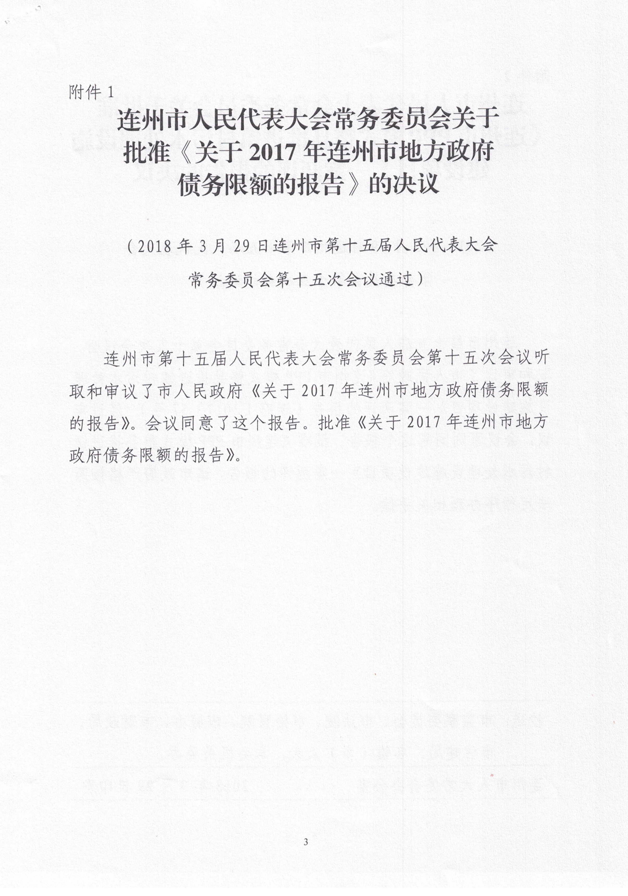 連州市人大常委會關(guān)于批準《關(guān)于2017年連州市地方政府債務限額的報告》的決議