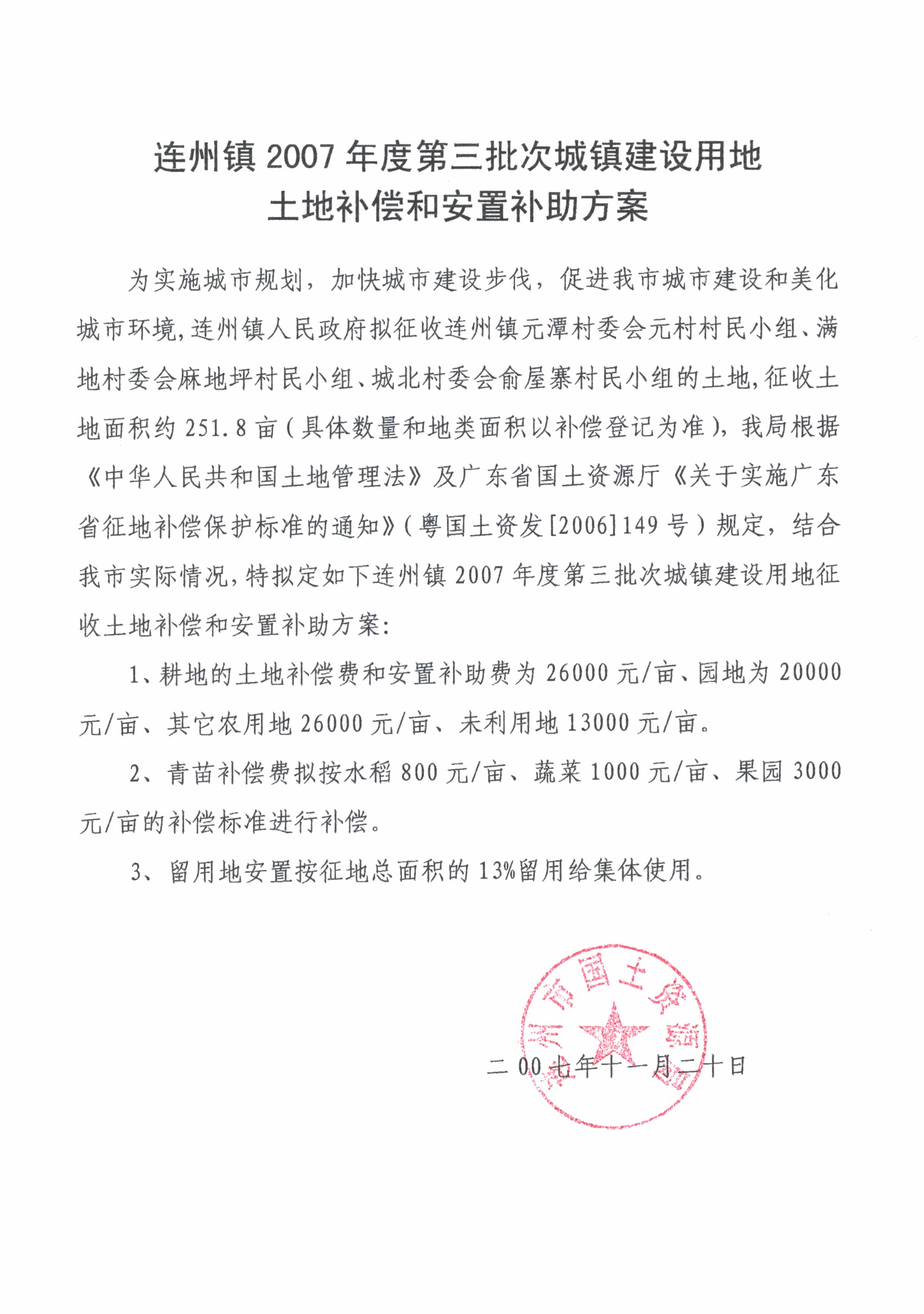 關(guān)于連州市連州鎮(zhèn)2007第三批次城鎮(zhèn)建設(shè)用地的征地補(bǔ)償安置方案公告