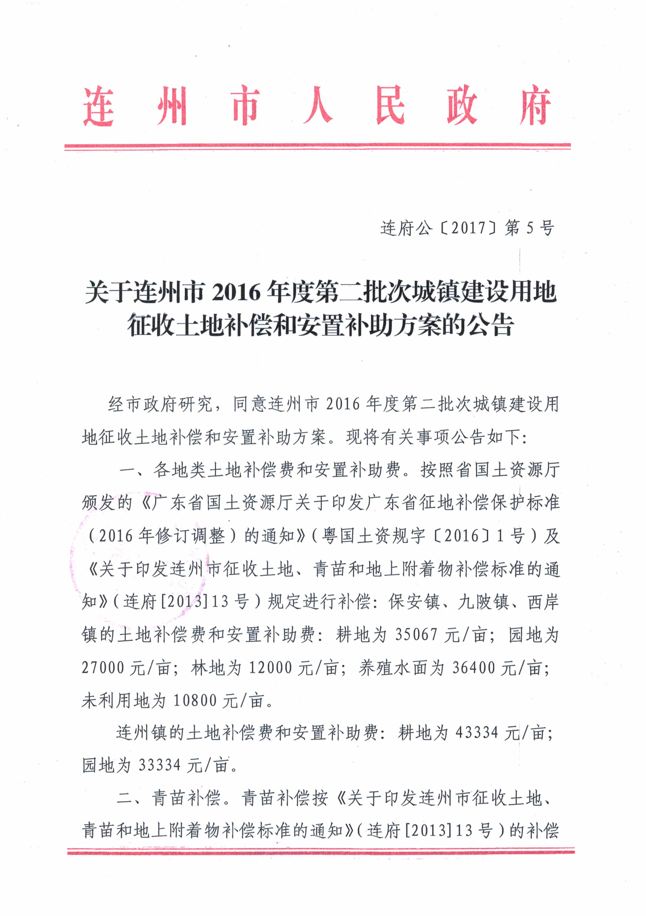 連州市2016年第二批次城鎮(zhèn)建設(shè)用地征地補(bǔ)償安置方案公告