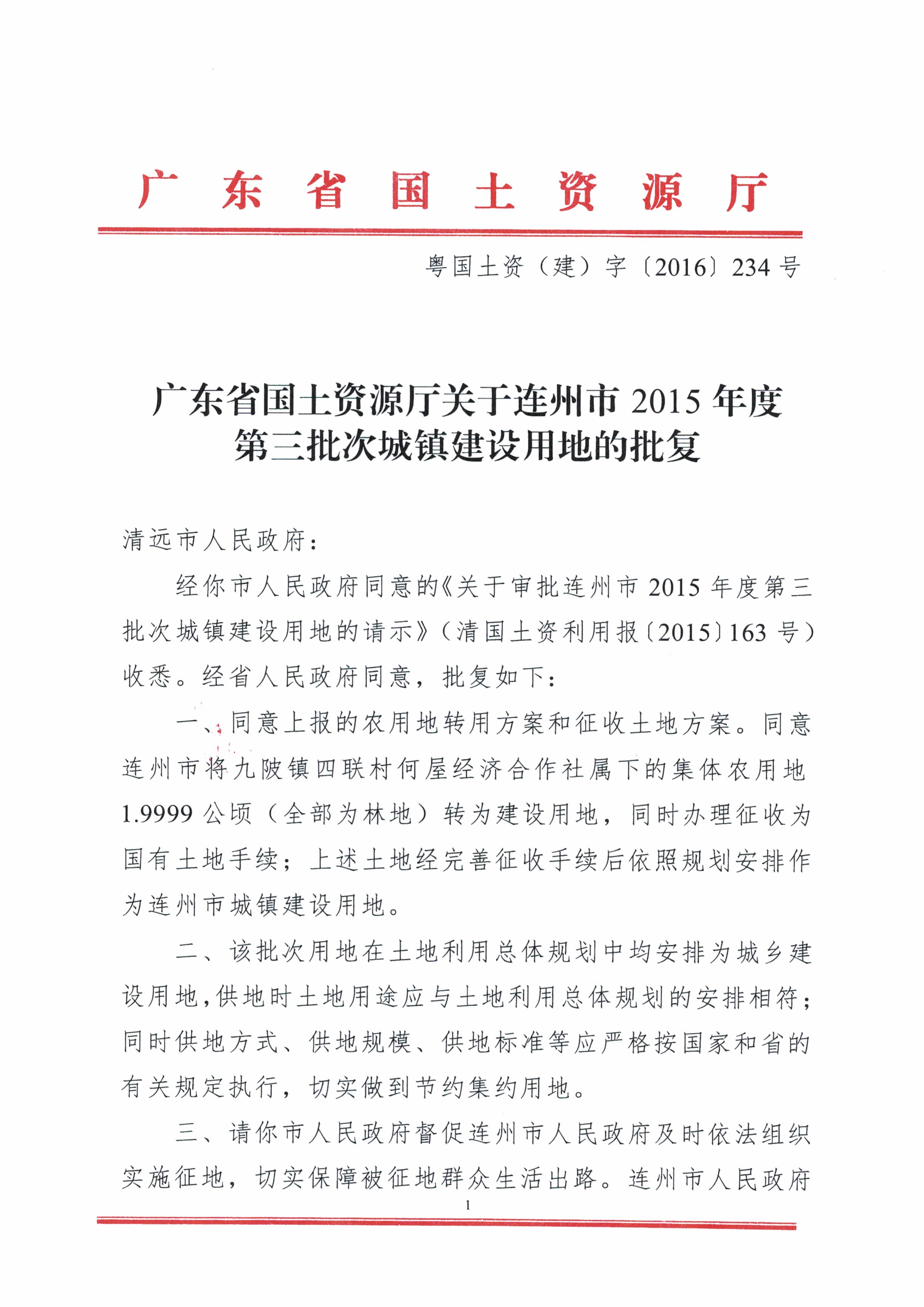連州市2015年度第三批次城鎮(zhèn)建設(shè)用地的批復(fù)