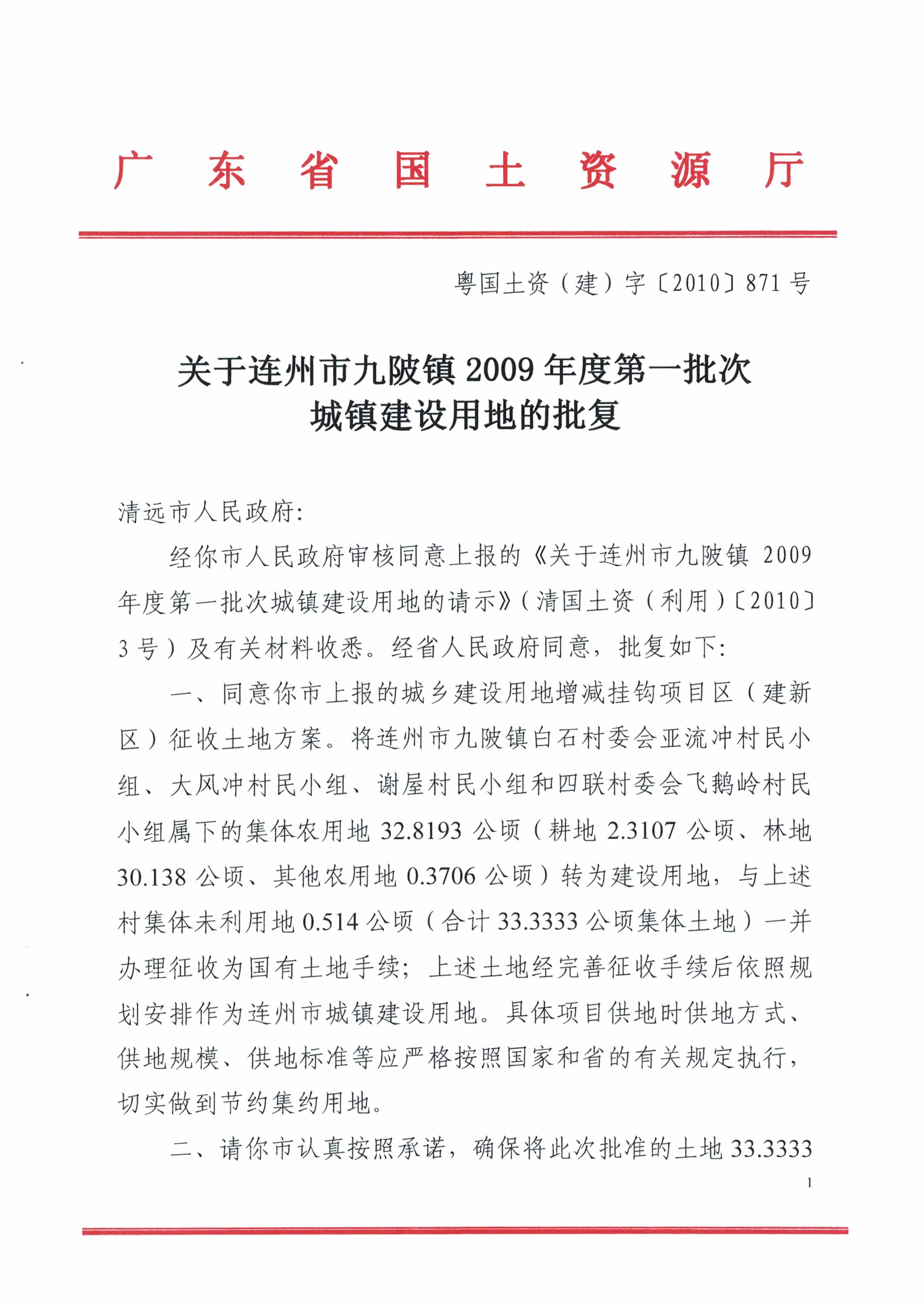 連州市九陂鎮(zhèn)2009年度第一批次城鎮(zhèn)建設(shè)用地的批復(fù)