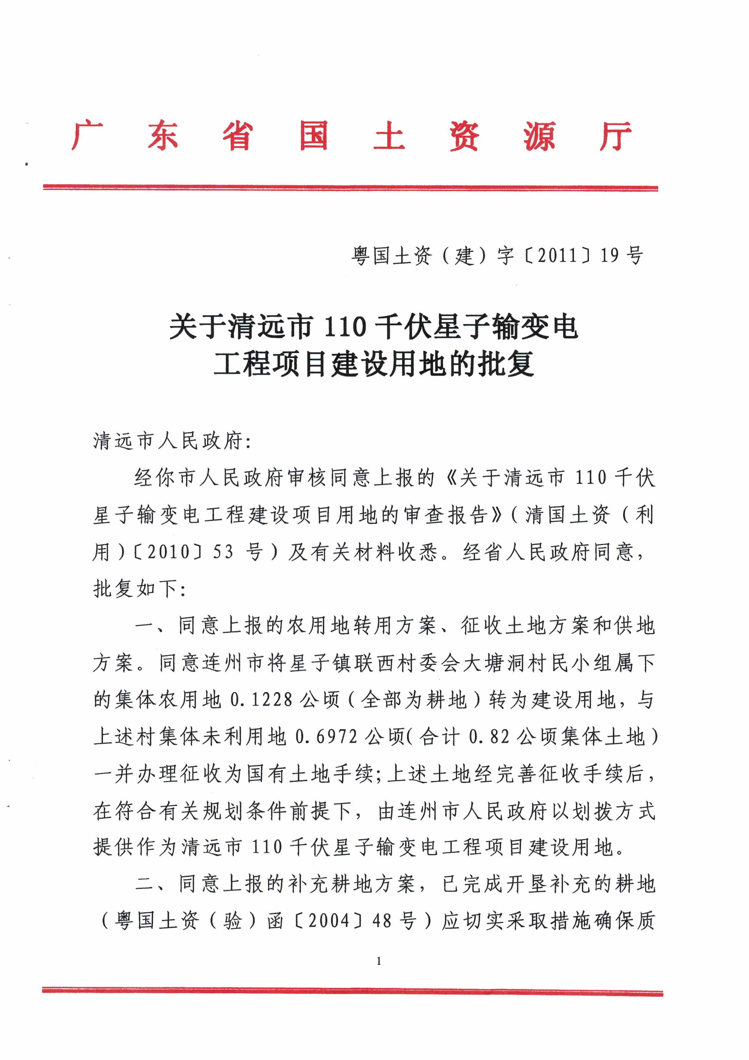 清遠(yuǎn)市110千伏星子輸變電工程項(xiàng)目建設(shè)用地的批復(fù)