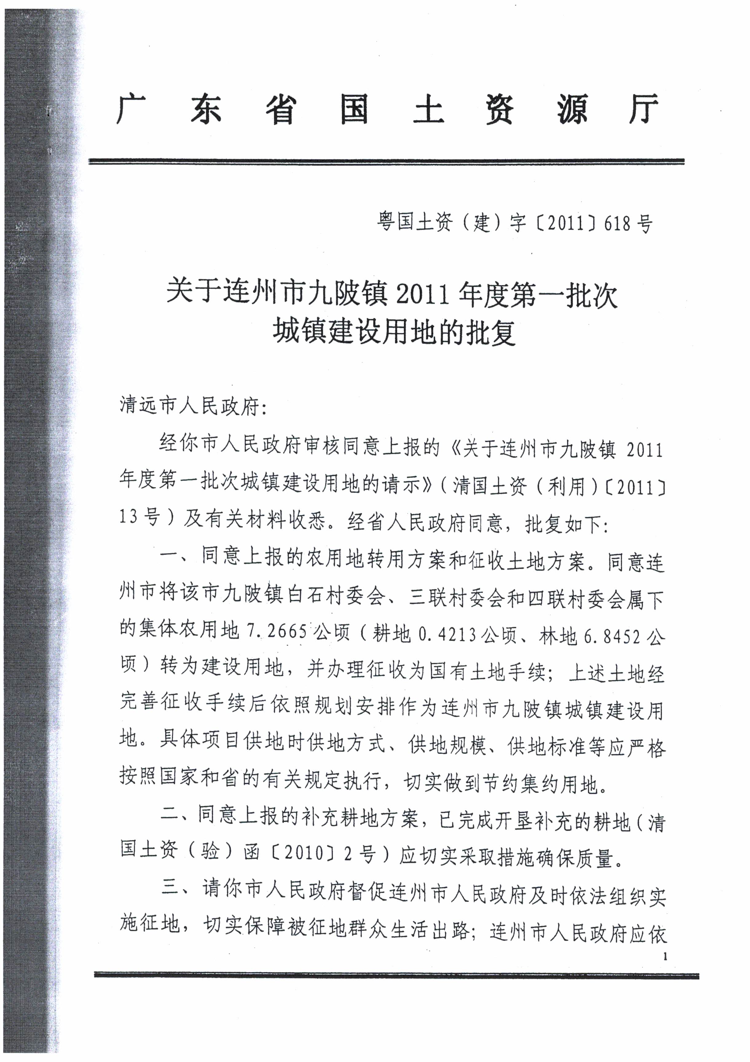 連州市九陂鎮(zhèn)2011年度第一批次城鎮(zhèn)建設(shè)用地的批復(fù)