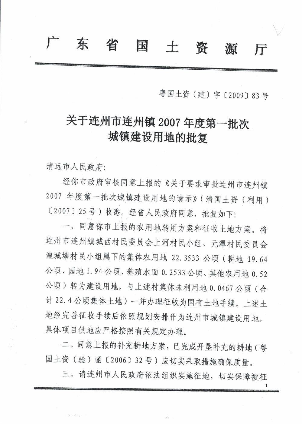 連州市連州鎮(zhèn)2007年度第一批次城鎮(zhèn)建設(shè)用地的批復(fù)