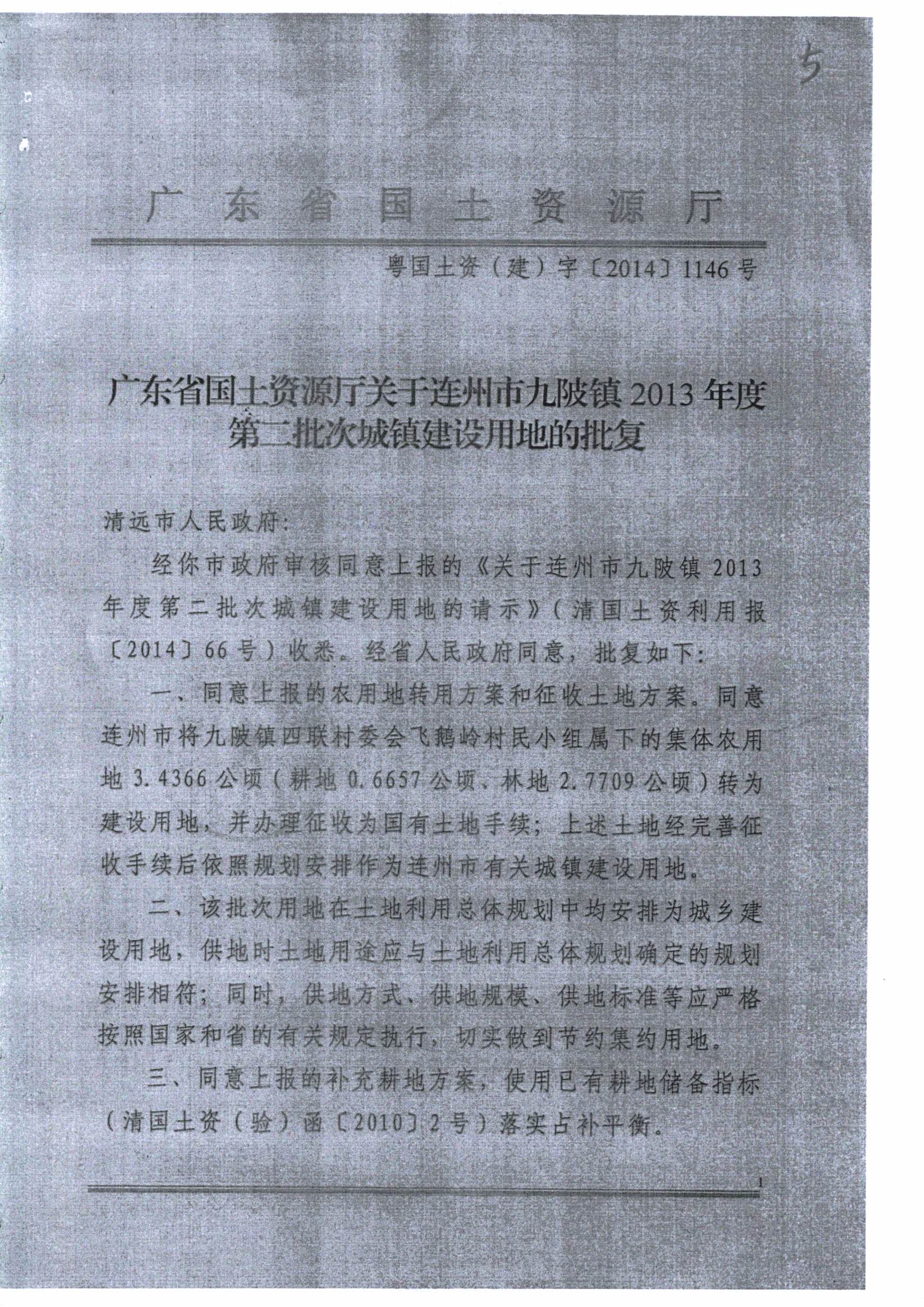 連州市九陂鎮(zhèn)2013年度第二批次城鎮(zhèn)建設用地的批復