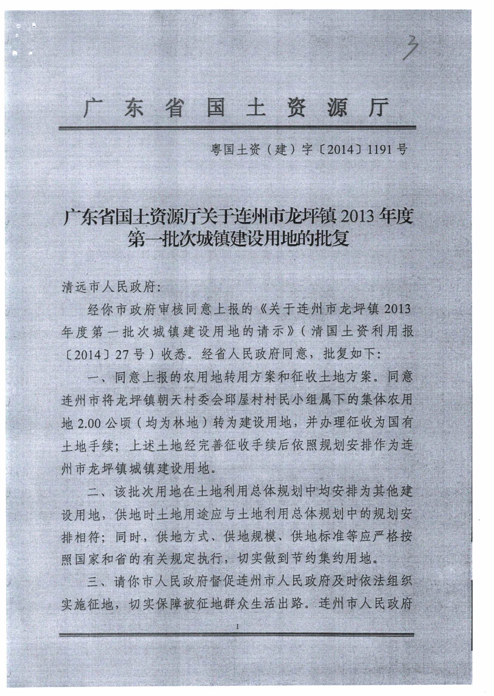 連州市龍坪鎮(zhèn)2013年度第一批次城鎮(zhèn)建設(shè)用地的批復(fù)