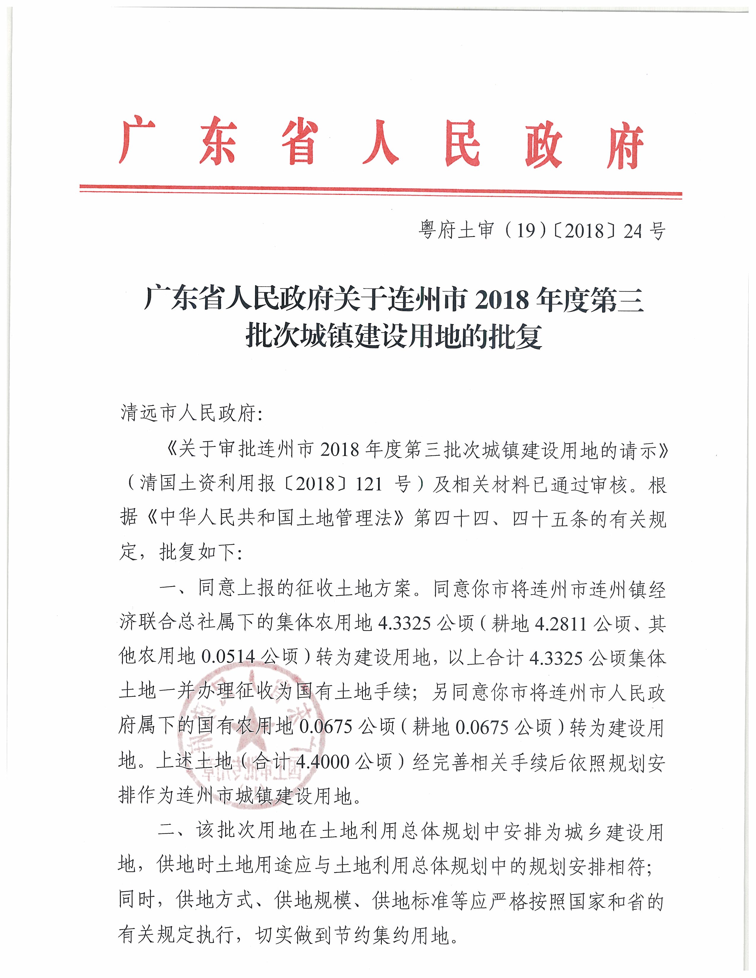 連州市2018年度第三批次城鎮(zhèn)建設(shè)用地的批復(fù)