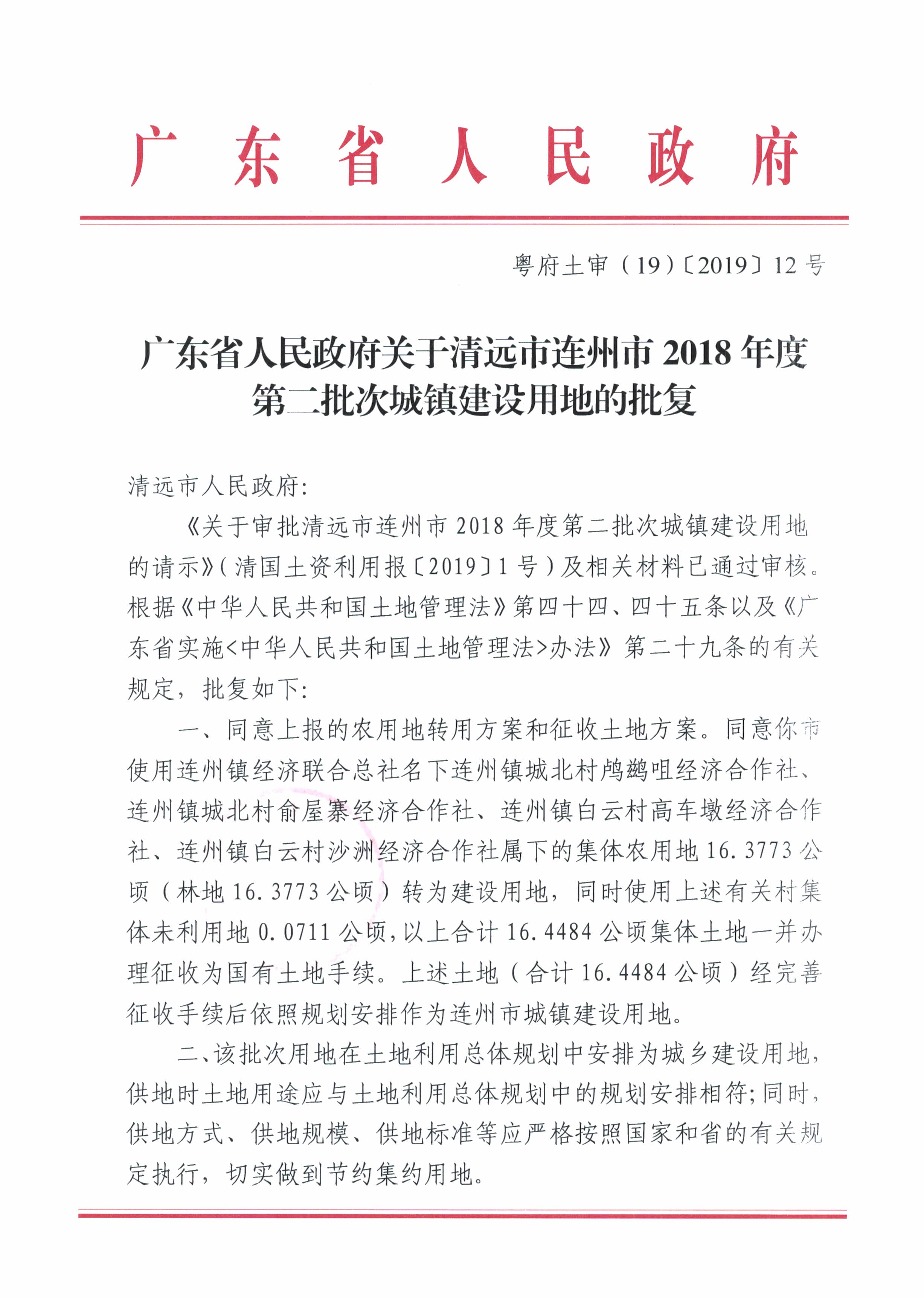 廣東省人民政府關(guān)于清遠(yuǎn)市連州市2018年度第二批次城鎮(zhèn)建設(shè)用地的批復(fù)
