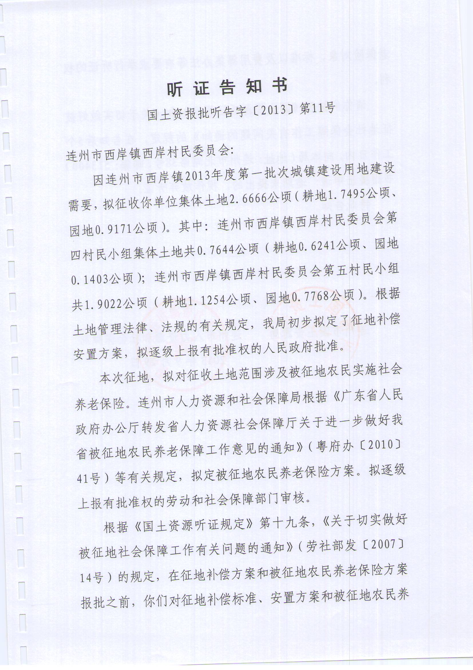 連州市西岸鎮(zhèn)2013年度第一批次城鎮(zhèn)建設(shè)用地聽證信息