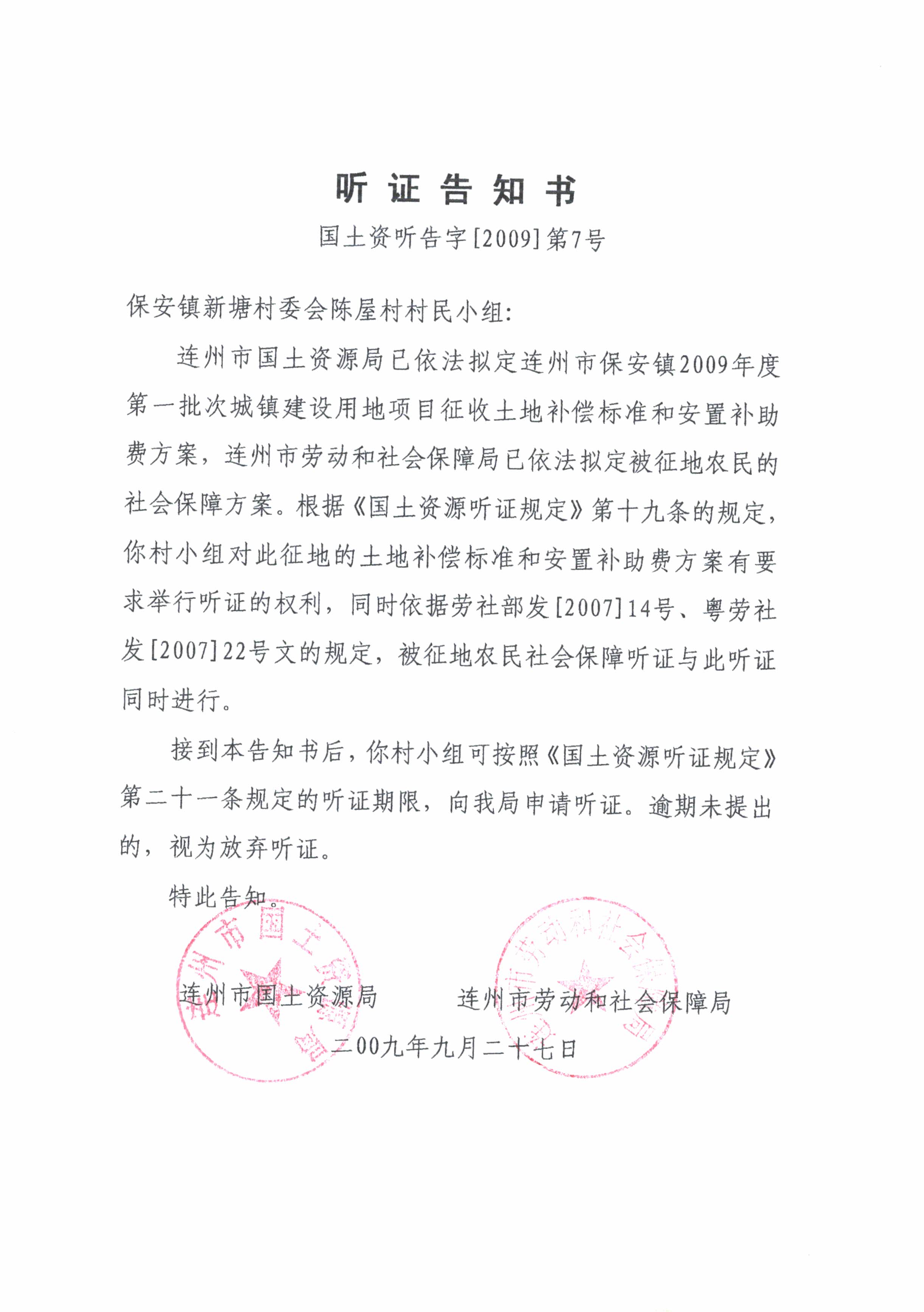 連州市保安鎮(zhèn)2009年度第一批次城鎮(zhèn)建設(shè)用地聽證信息