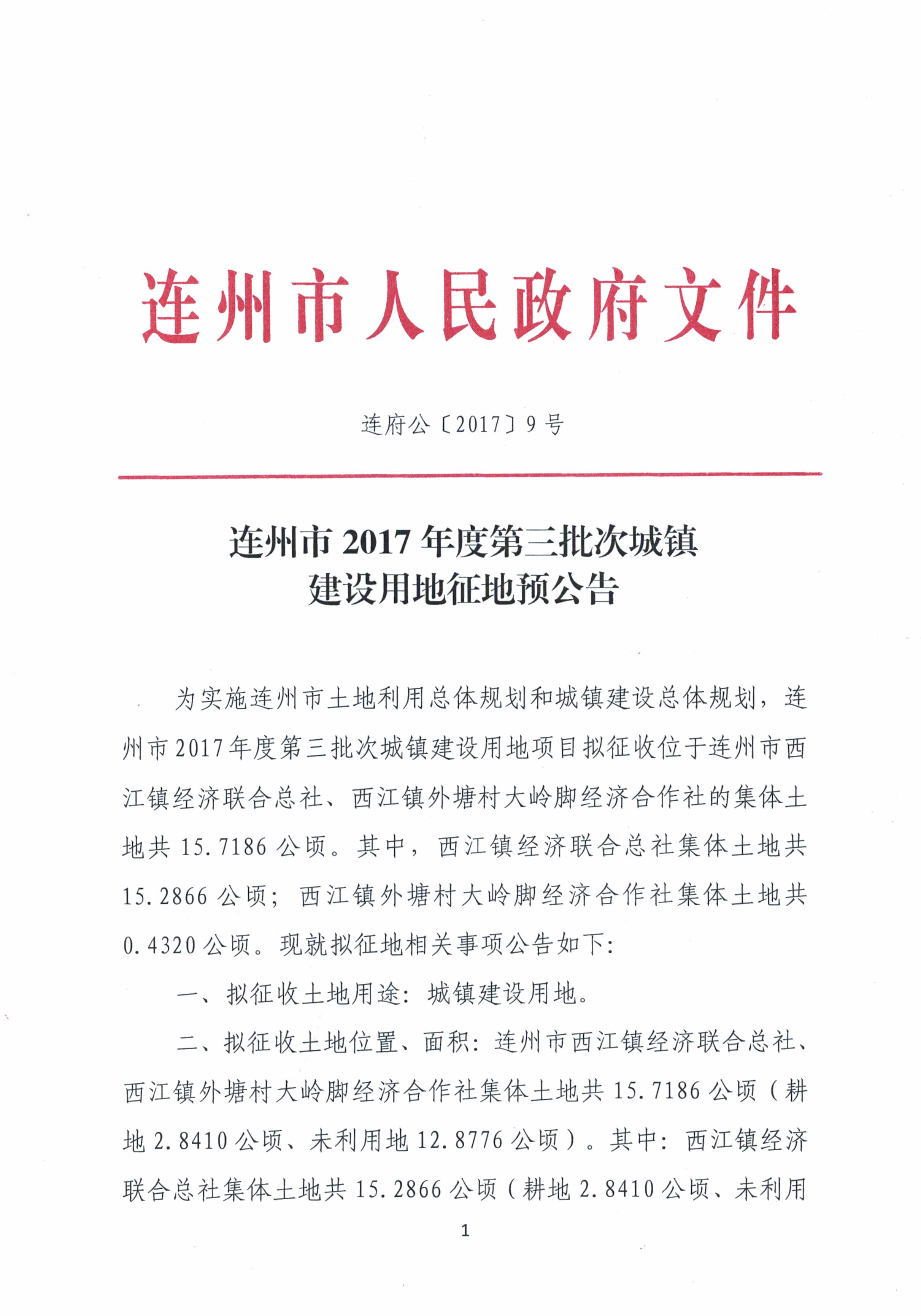 連州市2017第三批次城鎮(zhèn)建設用地征地預公告